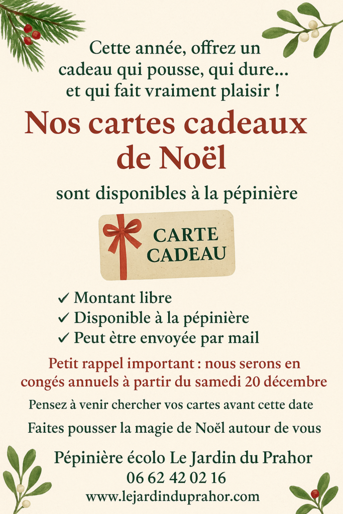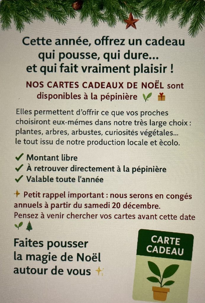 Pour Noël, offrez un cadeau qui pousse, qui dure, qui est local et qui fait vraiment plaisir ! Un chèque cadeaux sur toute la pépinière Ignorer