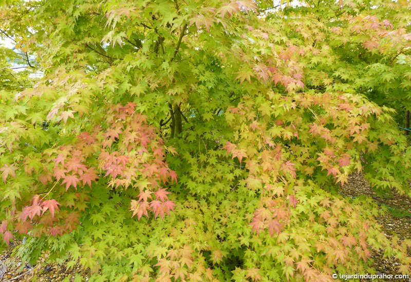 Comme tous les érables du Japon, il se remarque dans un jardin et pas que dans les jardins « Zen ». Il est peut être moins recherché que les autres variétés, ce qui est dommage car il passe par toutes les couleurs au fil des saisons. Il est bien touffu et buissonnant et son port est assez champêtre si vous le laissez pousser naturellement. Bien entendu il peut tout à fait être taillé et vous pouvez vous même sélectionner les branches afin de le structurer. Son feuillage est jaune-vert tendre marginé de rouge-orangé au printemps puis d’un vert franc en été et connait de très belles couleurs jaune puis orange-rouge feu à l’automne.