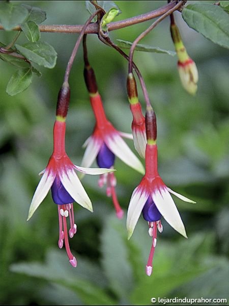 Ce fuchsia est une obtention horticole Néerlandaise. Il a été remarqué à Chantilly lors de l’édition de 2016. Son port souple, arbustif de 80 cm en tous sens, porte sur un petit feuillage vert foncé une multitude de fleurs tricolores. De mai à octobre il produira en profusion ses fleurs en clochette d’une grande délicatesse. De rose fuchsia, blanc et violet pourpre vif, il attire le regard sans être ostentatoire . Il est à placer à la mi – ombre mais peu accepter une petite place au soleil si le sol est modérément frais.