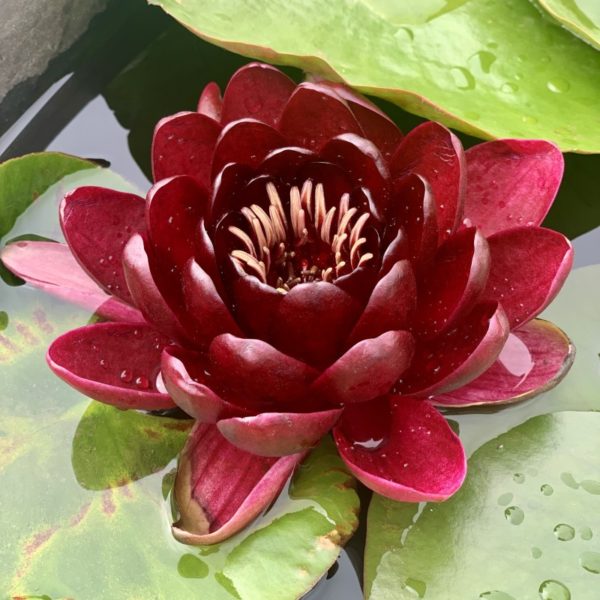 C’est un petit nénuphar à faible développement mais très florifère. Ses jeunes feuilles sont pourpres au démarrage. Elles se colorent par la suite, d’un beau vert foncé, toujours pourpré. Sa fleur double est particulièrement appréciée pour sa sublime couleur rouge pourpre profond, presque noire.
